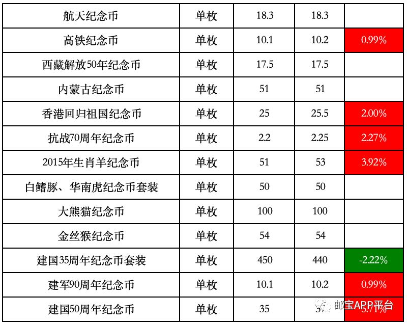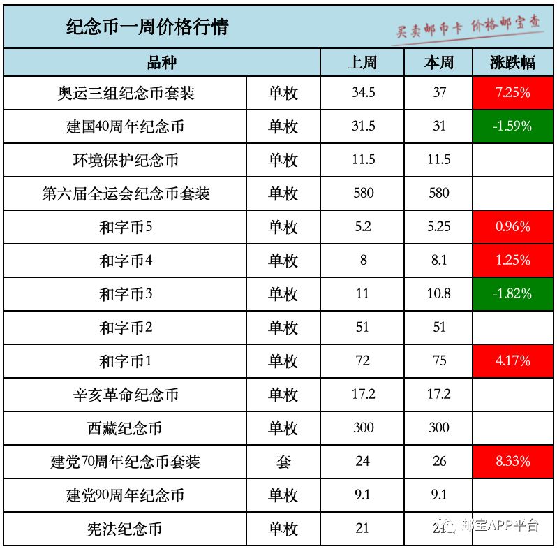 一周以来,纪念币行情与上周相比有所好转,小部分产品价格小幅上涨,只有3款产品价格小幅下滑。
