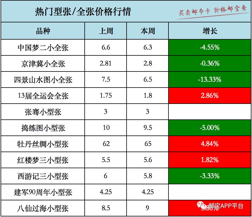 中国梦二小全张本周行情下跌4.55%,目前价格为6.3元;京津冀小全张本周行情为2.8元,上周一为2.81元,行情有所下跌;四景山水图小全张本周表现不佳,一路下跌,已从一周前的7.5元跌至目前6.5元的价格;13届全运会全张由1.75元涨至1.8元,行情有所回升;张骞小型张本周价格较为稳定,目前仍保持在3元;捣练图小型张目前为9.5元,较上周跌了0.5元;牡丹丝绸小型张本周价格为65元,上周为62元,价格再次上升;红楼梦三小型张最新行情为5.6元,涨了0.1元;西游记三小型张本周价格从6元再次跌回5.8元,行情起伏不定;建军90周年小型张本周表现稳定,目前价格为4.25元,八仙过海小型张最新价格为8元,行情上涨,涨幅为5.26%。