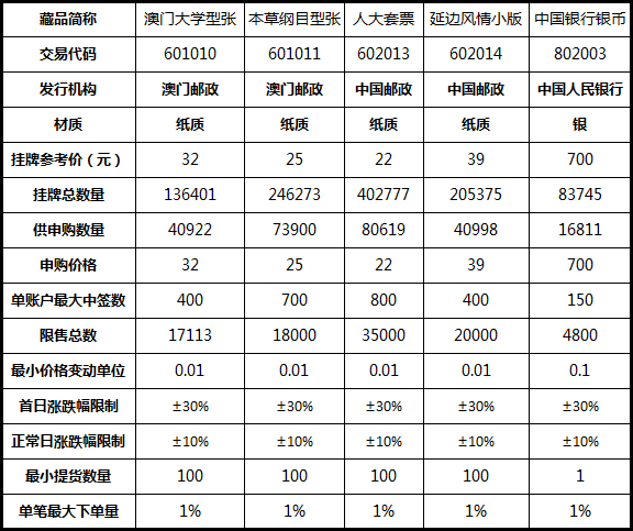 经湖南省中南邮票交易中心有限公司(以下称本中心)普通投资人会员申请,本中心审核通过,鉴定机构鉴定合格入库完毕,《澳门大学型张》、《本草纲目型张》、《人大套票》、《延边风情小版》、《中国银行银币》准予在本中心钱币邮票线上实物交易系统正式挂牌交易,具体事项公告如下: