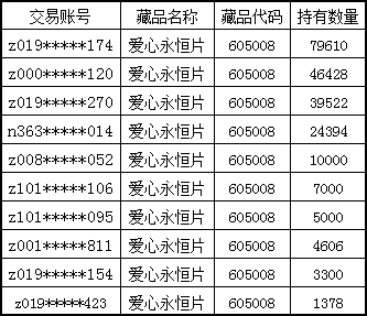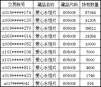 2、截止2016年2月1日收盘,藏品《爱心永恒片》持有人共计2338人,前十大持有人及持有数量如下: