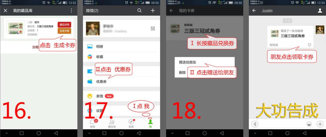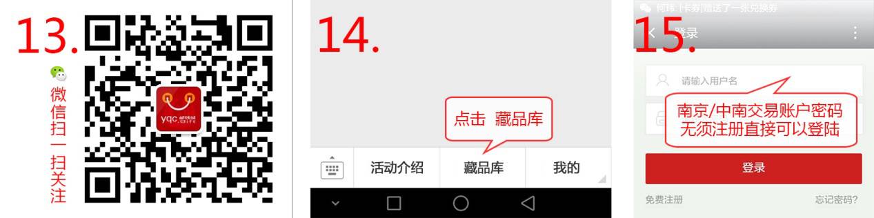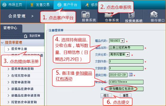 一、活动时间 3月18日-3月31日   二、活动内容 1、湖南省中南邮票交易中心(简称中南)、南京文交所钱币邮票交易中心(简称南京)的会员活动期间,可将交易账户内藏品转换为微信兑换券赠送给好友。 2、好友收到微信卡券,在『邮钱城』兑换并绑定中南/南京交易账户后,藏品4月1日20:00前自动转入该中南/南京交易账户; 3、活动结束后,未兑换成功的兑换券和兑换用户未关联中南/南京交易账户的藏品,则该藏品4月1日20:00前退回发起赠送的中南/南京交易账户。   三、活动流程 赠送流程: 1) 中南/南京会员在电脑客户端中注册提货单(备注:参加藏品红包活动)->打印提货单(提货密码设为:a1234567),藏品提货日的20:00前进入『邮钱城』藏品库; 2) 提货操作只能在交易时间内操作,提货藏品限定为单价在1000元以内,活动期间单个交易账户最大提货量不超过10万元; 3) 关注『邮钱城』微信服务号 ->点击[藏品库]->直接用中南/南京交易账号密码登陆 -> 点击[生成卡券]->点击[领取]; 4) 在微信我的卡券中能查看到刚刚生成的藏品兑换券了,长按兑换券就可以通过微信赠送。 兑换流程: 1) 微信朋友领取卡券后在微信我的卡券查看兑换券,点击[立即使用]->注册/登陆商城->[藏品库]查看兑换的藏品; 2) 活动期间兑换的藏品,在4月1日20:00自动转入『邮钱城』用户名绑定的中南/南京交易账户。   注明:新用户兑换微信朋友赠送的藏品券后,在商城注册中南/南京会员时,默认号段是该藏品券生成用户绑定的中南交易账号前5位/南京交易账号前4位;如新用户兑换了多张藏品券以首张兑换藏品券生成用户绑定的中南/南京交易账号为依据。   湖南省中南邮票交易中心有限公司 2016年3月18日             附件: 中南/南京提货-生成卡券-赠送 流程图